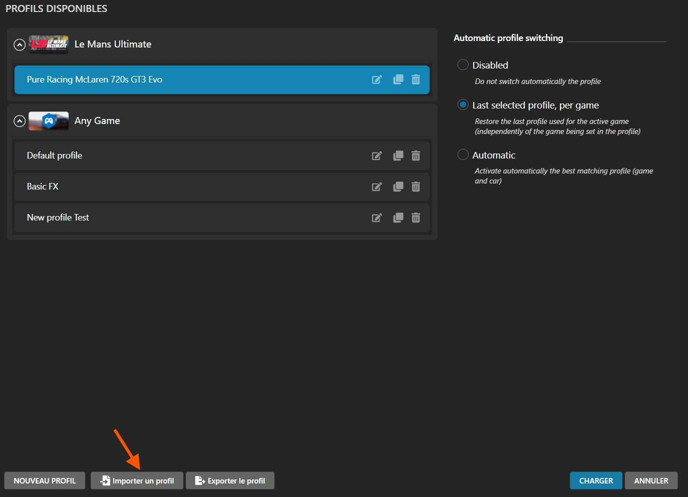 6. Cliquez sur le bouton « Import profile »