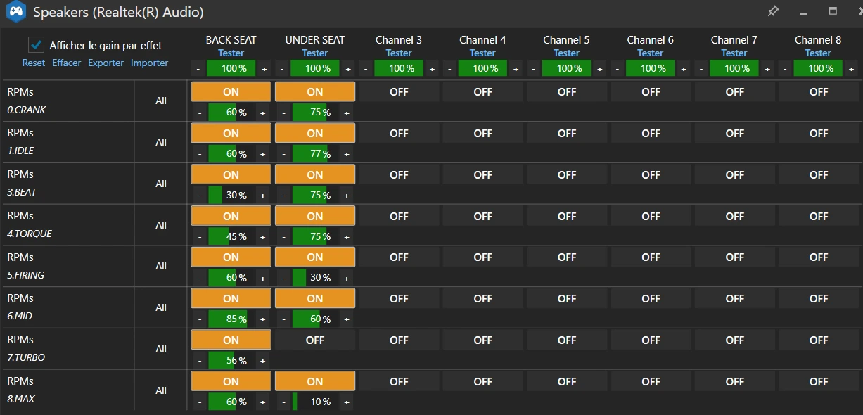 · Assignez dans l'onglet « Sortie Son » les effets RPMs au bass shaker principal et secondaire